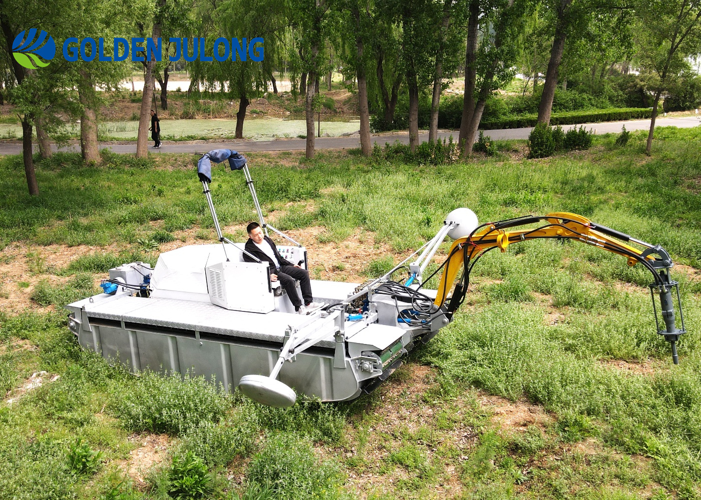 Julong amphibious multi-function dredger made by aluminium alloy, adopts the design of buoyancy tank and crawler, which can walk on land and work in water. It is equipped with replaceable working units such as excavating bucket, cutter, dredge pump, collecting rake and collecting fork, which can complete the operation like excavating, harvesting, mud suction & discharge, and weeds & garbage cleaning etc.